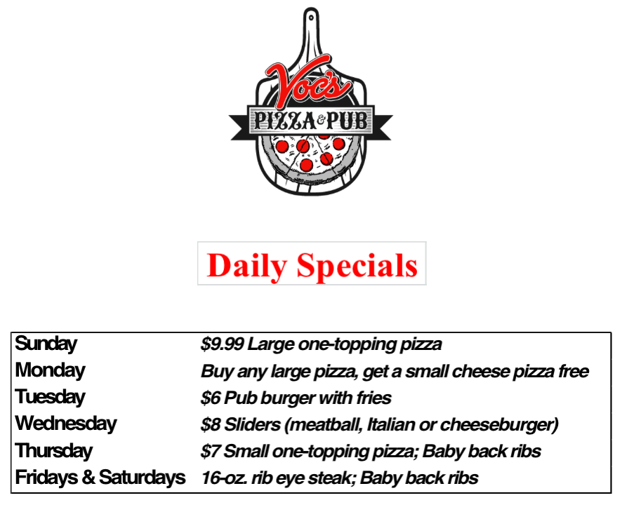 At Voc's Dunn's Corners Pizza Menu, you'll find a variety of mouth-watering pizza options perfect for any craving. Whether you're a fan of classic toppings like pepperoni and sausage or you're in the mood for something more adventurous, this menu has you covered. They offer a wide selection of specialty pizzas, including gourmet choices with fresh, quality ingredients. Beyond pizza, their menu includes delicious sides like crispy garlic bread and fresh salads, making it easy to build the perfect meal. The relaxed atmosphere of the restaurant is the perfect place to enjoy their tasty offerings, whether you're dining in or grabbing a quick bite to go.